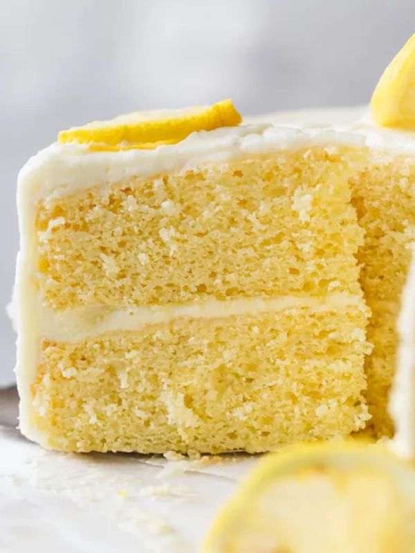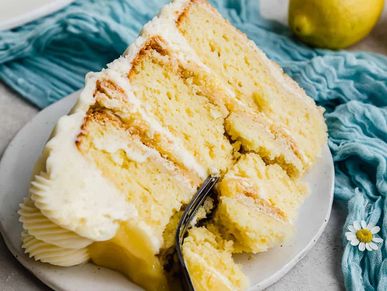 Soft lemon cake, layered with Swiss meringue buttercream, filled with lemon curd and shortbread cookie crumb.