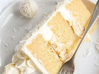 Coconut cake, layered with coconut Swiss meringue buttercream, filled with white chocolate ganache and toasted almond pieces.