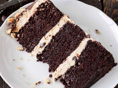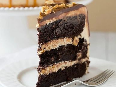 Double chocolate cake, layered with peanut butter buttercream and salted caramel, filled with peanuts.