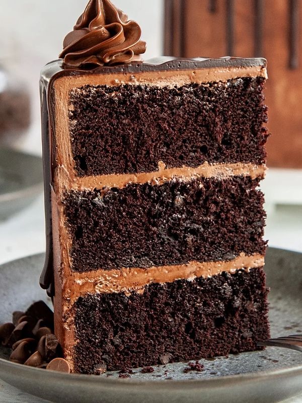 Chocolate cake layered with vanilla American buttercream, filled with black cherries and dark chocolate ganache.