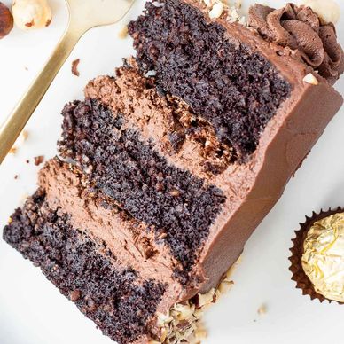 Chocolate cake, layered with Nutella cream cheese icing and milk chocolate ganache, filled with toasted hazelnuts and chocolate cookie bits.