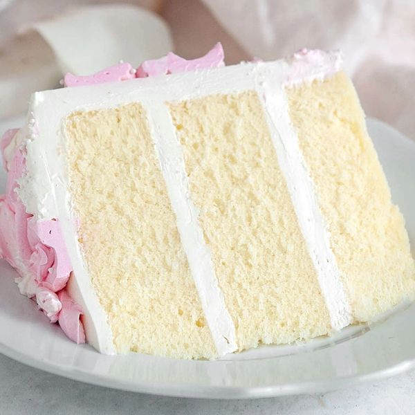 Vanilla cake, layered with vanilla Swiss meringue buttercream, filled with raspberry couli and white chocolate ganache.